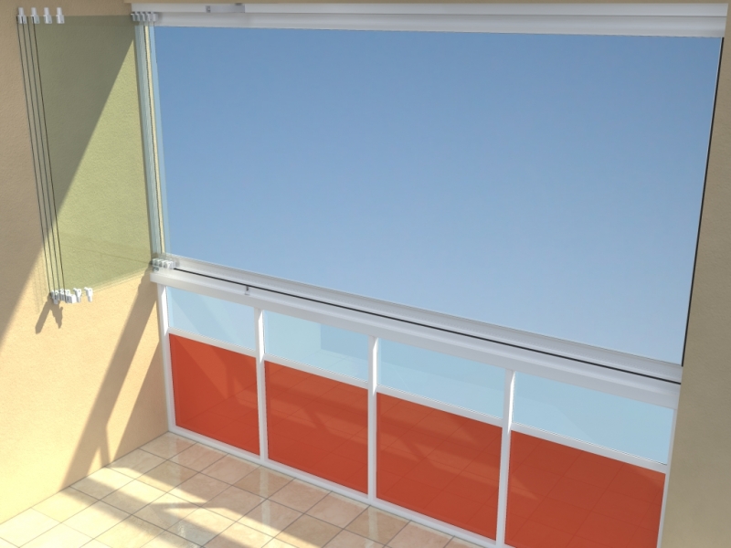 The AluVista frameless glazing system is a sliding and revolving glazing system without vertical aluminium dividing frames. Leaves made of transparent safety glass slide along a bottom rail at the railing height and are guided by a top rail of the same shape (does not interfere with the loggia or balcony interior). Water drainage is provided via drain holes. Special sealing between the leaves and side enclosing profiles guarantees almost perfect tightness of the structure. Vent holes ensure permanent and natural air exchange. The opening method enables safe and comfortable washing. The AluVista system can be complemented with convenient shading by window blinds.